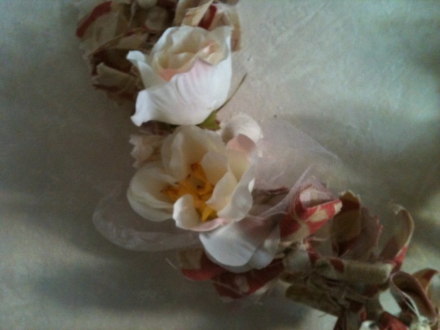 - Add some silk flowers, ( you tie these into the fabric knots as you go along) Later you can apply a bit of hot glue if you want them to sit better.
